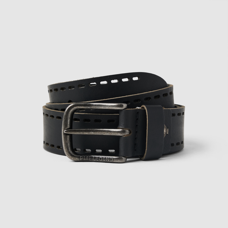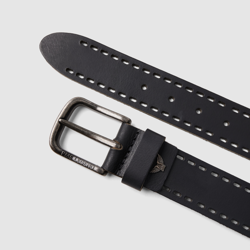 Opasek zaujme na první pohled dvojitou řadou dekorativní perforace po celém obvodu, která mu dodává drsný, technický vzhled inspirovaný detaily z kokpitů letadel. Masivní kovová spona s kouřovou patinou (gunmetal) a vyrytým logem PME Legend podtrhuje autenticitu značky.